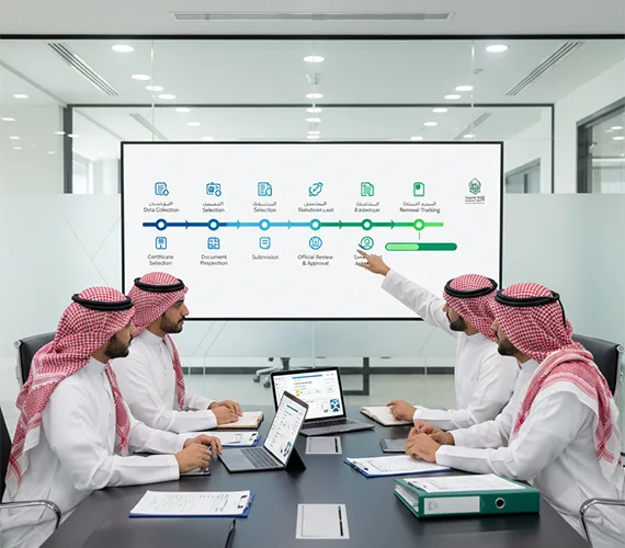 It is a service that aims to help companies and establishments obtain and update the required regulatory certificates from government agencies such as Zakat and Income, Social Insurance, Human Resources, Value Added Tax and others, to ensure the establishment’s full compliance with Saudi regulations and the continuity of its work without interruption.
